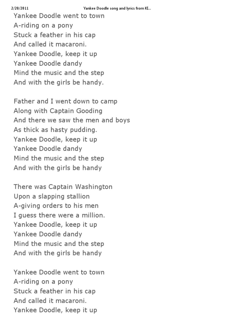 And there was captain washington and gentle folks about him they say he's grown so tarnal proud he will not ride without them. Yankee doodle, keep it up yankee doodle dandy mind the music and the step and with the girls be handy. He stuck a feather in his hat. More images for yankee doodle lyrics » Mind the music and the step.
